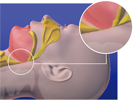 睡眠時無呼吸症候群(OSA)とは、睡眠中に舌(シタ)や軟口蓋(上あご奥の柔らかい粘膜)が弛緩(緩むこと)し、一時的に気道が閉塞されるため、呼吸が停止する病気です。